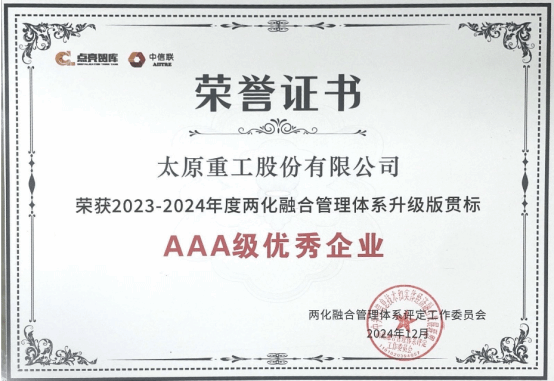 近日,太原重工股份有限公司成功獲評(píng)2023-2024年度兩化融合管理體系升級(jí)貫標(biāo)AAA級(jí)優(yōu)秀企業(yè),成為山西裝備制造業(yè)首家被工業(yè)和信息化部認(rèn)可的國家兩化融合管理體系A(chǔ)AA級(jí)的企業(yè),標(biāo)志著公司成為行業(yè)前列的兩化融合管理示范企業(yè)。